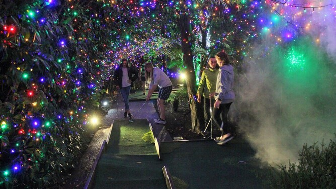 During the day, Mini Golf Rotorua is great - they have bunnies, bubble machines, a great playlist on the speakers, waterfalls, and fishponds. But at night, the whole place is transformed, with thousands of multi-coloured fairy lights wrapped around the trees and obstacles, and they even bring out fog machines and lasers.
