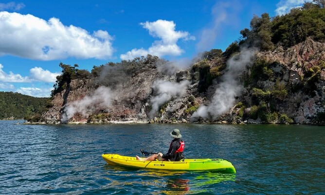 As you paddle, you’ll move past steaming cliffs, hidden vents, and sections of shoreline where geothermal water pours straight into the lake. Steam drifts across the surface, native bush hangs over the edges, and the whole area feels untouched and protected. It’s a gentle, steady paddle suitable for beginners, with plenty of time to stop, look around, and take in the atmosphere.